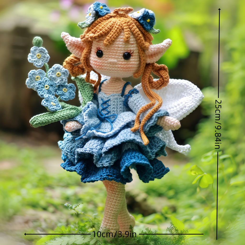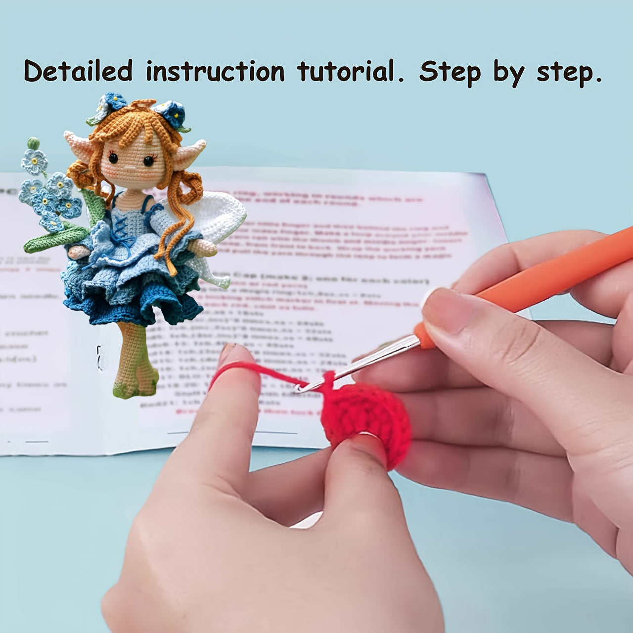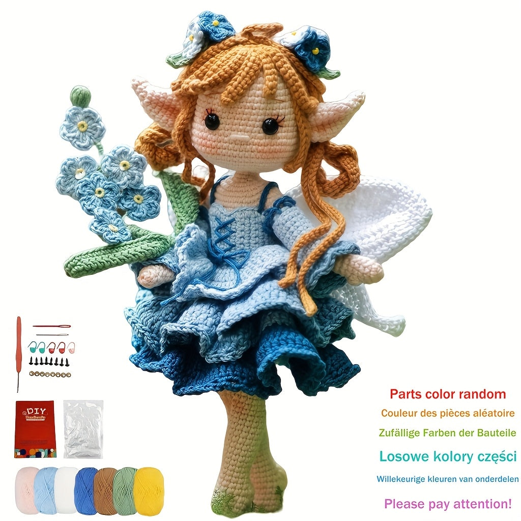 1pc/set, beginner's DIY crochet set, fairy girl holding blue flowers, DIY crochet materials include yarn and hooks, complete DIY handicraft set with crochet teaching steps, perfect for home decoration and gifts, suitable for experienced crochet enthusiast